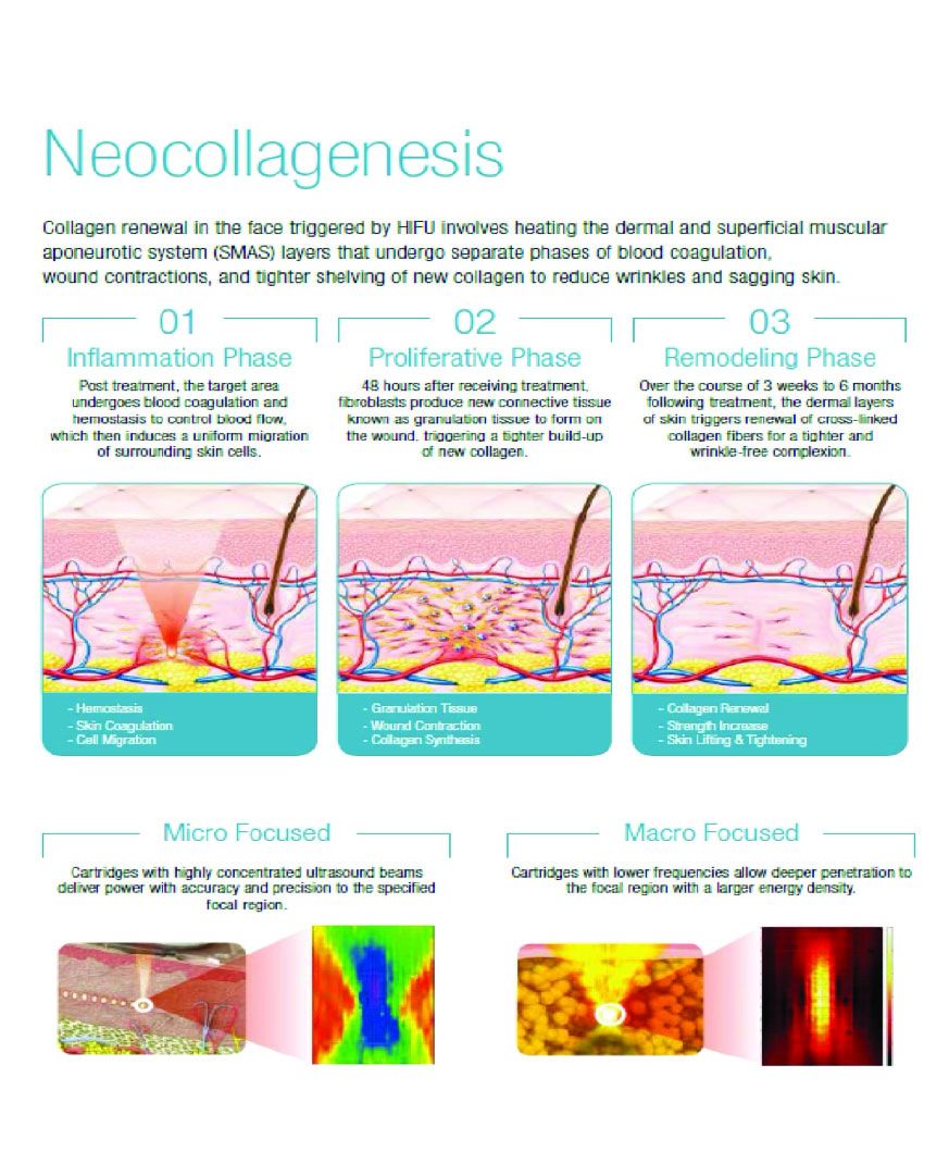HIFU transducers deliver an equal distribution of ultrasound waves into multiple layers of skin and body tissues without direct contact to the epidermis. Fitted with multiple cartridges that generate thermal energy, it maintains stabilized temperatures of 65-75 C to induce coagulation for collagen renewal in the face and tightens body tissues for contouring waistlines, thighs and other parts of the body.